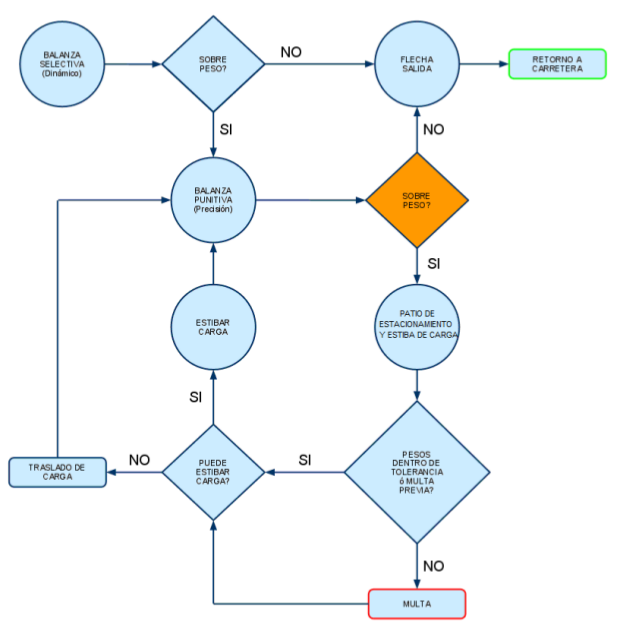 La Balanza de Selección está ubicada en una pista lateral y los vehículos se pesan en ella a velocidad media de hasta 60 Km/h, pudiendo ser desviados a la Balanza de Precisión para un pesaje punitivo o regresar sin detenerse a la carretera sin mayor demora ni afectación de la fluidez del tránsito. El procesamiento del pesaje está distribuido en distintas unidades computarizadas. A Continuación se presenta un diagrama que muestra las etapas por las que pasa un vehículo al ingresar a la plaza de pesaje, y las diferentes acciones que se realizan en torno a él, dependiendo de sus características.